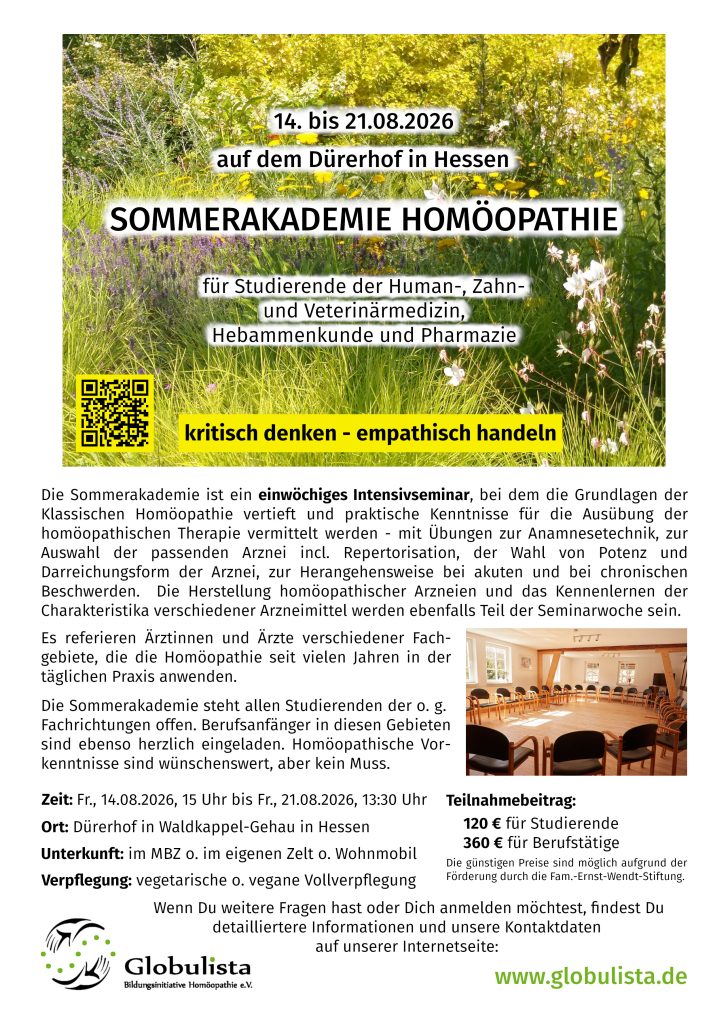 Außerdem findet jedes Jahr die „Sommerakademie für Integrative Medizin“ an der Universität Witten/Herdecke statt, bei der die Homöopathie neben vielen anderen Methoden aus dem Spektrum der Integrativmedizin auch ihren Platz hat. Auf diese Sommerakademie weisen wir gern hin, da sie eine gute Möglichkeit ist für all jene, die gern verschiedene Ansätze kennenlernen möchten.