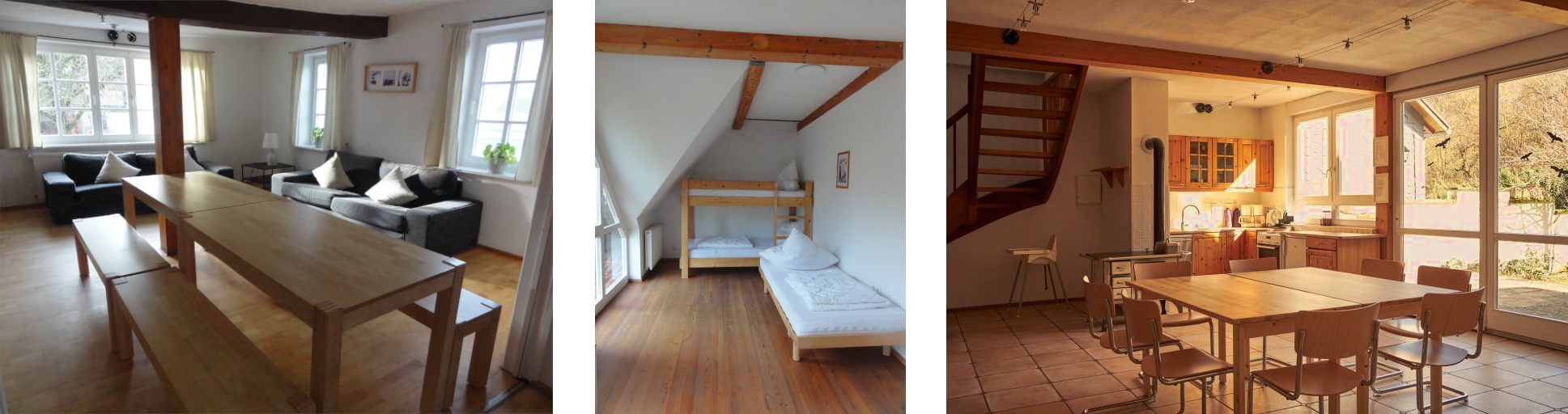 Als ehemaliger Bauernhof, gelegen in einem verschlafenen Dörfchen, eingebettet in eine Landschaft mit Hügeln, Wiesen, Feldern und Wäldern, verfügt er über drei Gebäudeteile, die neben den Zimmern jeweils auch mit einer Küche und einem Wohnzimmer oder Speisesaal ausgestattet sind. Daran schließt sich ein weitläufiges Grundstück an, auf dem sich Möglichkeiten zum Grillen, ein Lagerfeuerplatz, ein Volleyballfeld, eine urige Streuobstwiese und eine flache Wiese, auf der Zelte aufgeschlagen werden können, befinden.